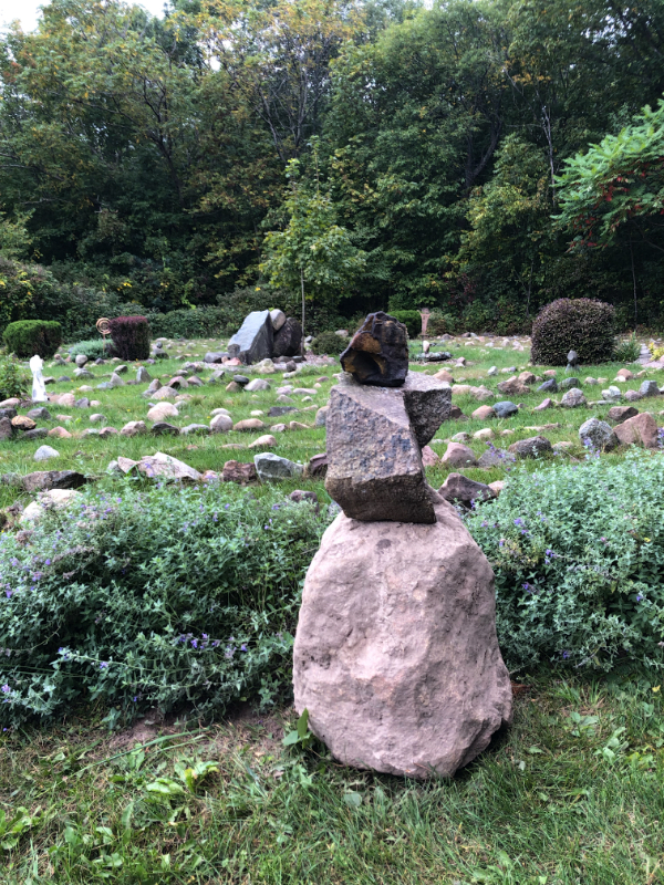 The labyrinth was the easiest place to put the rock and the easiest spot to set it down was on the outer edge. Without any pre-planning, I grabbed two other available rocks from nearby and placed them on top, reserving the right to switch them out later if we come across ones we like better.