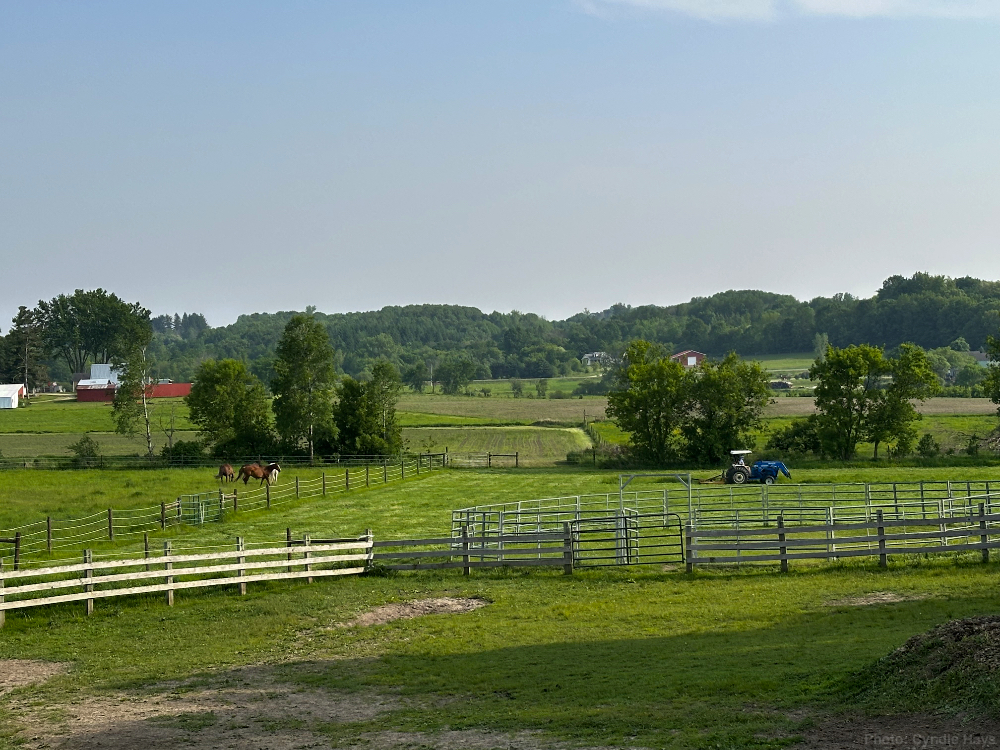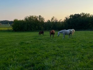 I had closed the gates to keep the horses out of the back pasture, but they were free to graze in the recently mowed hay field. I always love seeing them out on the grass instead of standing in a stupor under the overhang, which tends to be their preference much of the time. That’s Mia all by herself in the image.