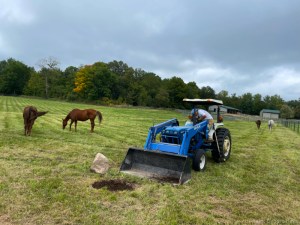 When I told Cyndie I was ready to drive the tractor into the back pasture to pick up that rock, she asked if she should move the horses out. I figured they wouldn’t be a problem and suggested she leave them be, without expecting them to be near as chill as they ended up being when the tractor rumbled past them all.