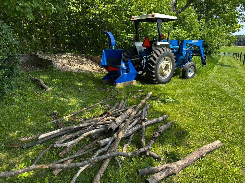 Sprucing the place up in preparation for visitors is something I know how to do. The freshly maintained diesel tractor will be used to create a new batch of wood chips out of some of the endless piles of tree limbs stacked throughout our woods.