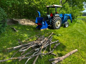 Knowing that this kind of rain was on its way, we jumped to accomplish as much as possible on Saturday afternoon during a dry spell. I pulled out the diesel tractor, rearranged equipment, and retrieved the wood chipper from the back of the garage.