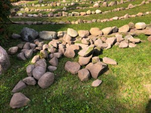 Since it is harvest season, we decided to grab a couple of shovels and head into our woods to harvest rocks for use in the labyrinth. The back half of the circling pathway needs additional rocks to fully complete the borders. This time of year it is easier to see where old rock piles have been swallowed by the woods. From now until the ground freezes becomes prime rock harvesting time.