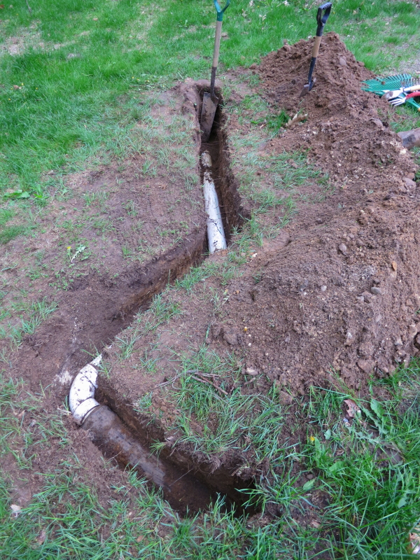 I did some trenching after I got home from work yesterday. To my surprise, I learned that the drain does not run in a straight line. I’m not sure why they did it this way, but one guess is to improve the position to the drain field.