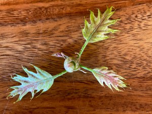 Speaking of new leaves opening up, I found this little specimen of baby oak leaves on the driveway beneath one of our biggest trees. They hardly got started and now it’s already over for them. That little sprig was about an inch across.