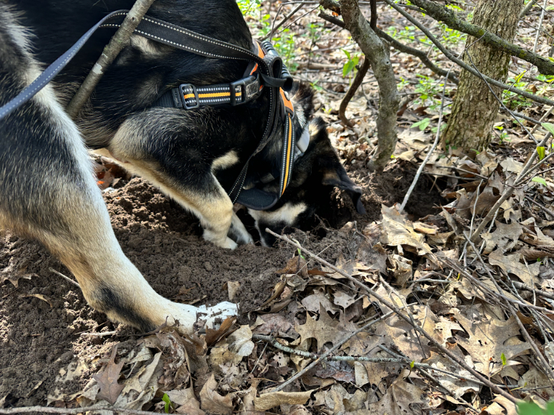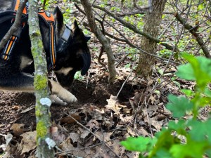 It is no surprise to learn that Asher digs after the scent of critters in the ground similar to the way our previous dog, Delilah did. Since the digging done by dogs is so destructive to our lawn areas, we spend a lot of energy discouraging digging in the grass. However, when on walks through the woods, I like to give a dog the chance to exercise their natural instinct. Yesterday, Asher plowed after something his nose told him was there.