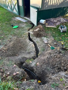 What’d you do yesterday? I dug through dry, packed gravel that was as hard as concrete to uncover even more of the AC power wires to the barn. With Cyndie’s participation, we worked together from two ends and met in the middle.