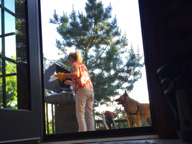 The weather was HOT and HUMID at the beginning of the evening, but just as the grill was getting ready for cooking, heavy rain began to fall and that cooled things off a little. Elliott braved the downpour, beneath his hanging umbrella over the grill, and prepared chicken and burgers. The rest of us were to bring the sides.