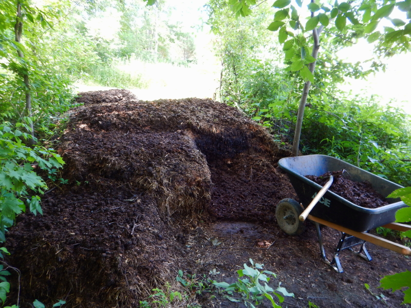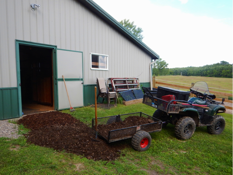 Between the thundering copious downpours yesterday —which by this morning have dropped a 24-hour accumulated total of 5 inches of rain on us— I began production of our first prototype mix of custom horse-manure-fertilized growing soil. It was an extension of my working on the rock pile we received from a neighboring farm field last spring.