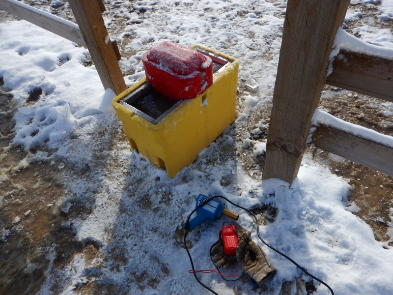 In addition to cleaning up after the holiday celebration, we had a frozen waterer that needed attention. My previous under-thought attempts to work around the problem had all proved insufficient. Luckily, Cyndie had provided an alternative bucket of water from the hydrant in the barn that the horses were using whenever the automatic waterer became a solid block.