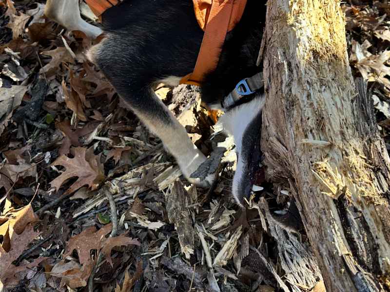 A couple of days ago, back before weather conditions turned Arctic overnight, I let Asher lead an off-the-trails exploration through our woods. He stopped at this downed tree and began frantically chewing on it, I’m guessing because he detected some delicious-smelling critter hiding in the middle.