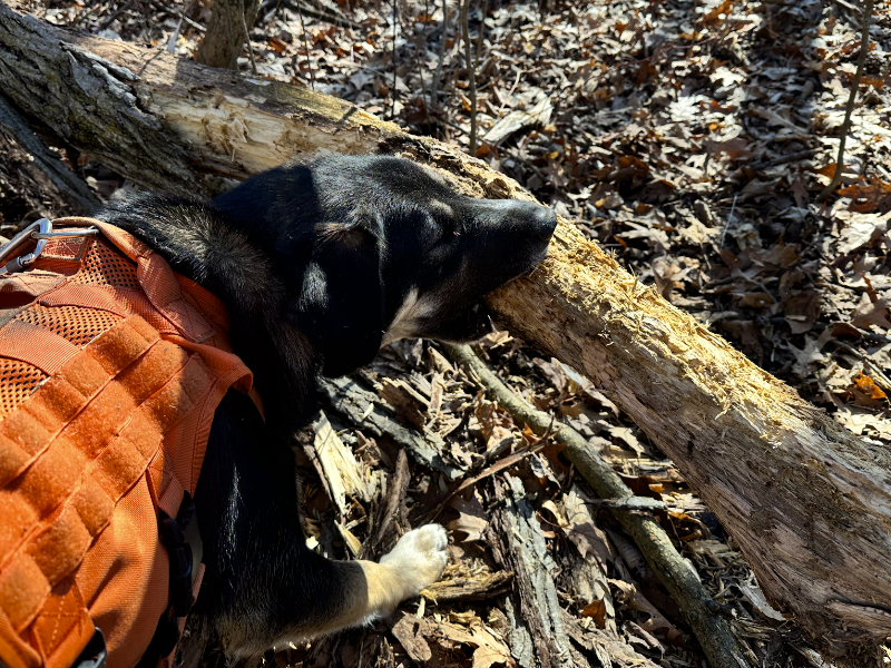 That success inspired me to grab the trail cam and set it up by the fence where there is an obvious animal trail that I believe is our neighboring fox. Asher and I left that spot and headed down the Perimeter Trail toward a series of young oak trees from which I wanted to remove low branches. To keep the dog tethered to me, I brought a clip to hook his leash to one of my belt loops. That allowed me to have both hands free to tend to my pruning.