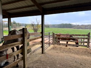 Yesterday morning, they were all chill as could be when Asher and I rounded the corner of the path around the back pasture into sight of the barn. They stood patiently while I cleaned everything up beneath the overhang, sometimes watching me but usually appearing to ignore me as they kept their eyes on the distant landscape.