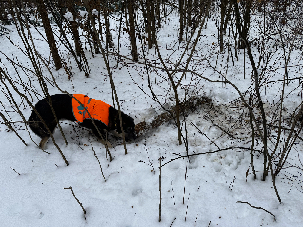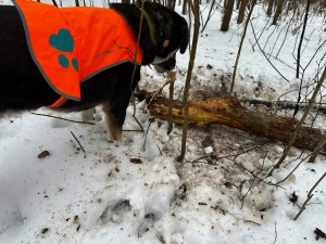 Two days later, we received what I feel is the worst weather for winter: rain. Once again, the snow is a saturated mess. I took Asher for an afternoon explore, and he fixated on a dead tree trunk that he seemed certain contained a rodent snack.