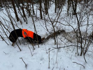 Not that darkness is the only time he faces temptations to chase prey. The rabbits have been plentiful this year, and he is more than happy to race after them at every opportunity. They are creating well-worn trails in the snow toward the barn overhang, where there is an endless supply of spilled senior horse food pellets to eat.