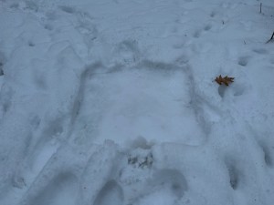He is enthralled with the scent he picks up from the deer tracks in the snow and would gladly follow them endlessly if we allowed. A gnome home in the trunk of a tree didn’t even get a sniff from him, probably because it looks like they must have traveled south for the winter.
