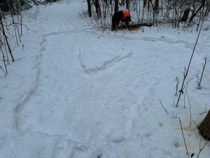 When we weren’t busy eating, we were outside giving Asher a chance to explore the woods around the cabin. He was a good sport about staying in contact with us when we let him wander a little bit to follow the obvious deer tracks in the snow.
