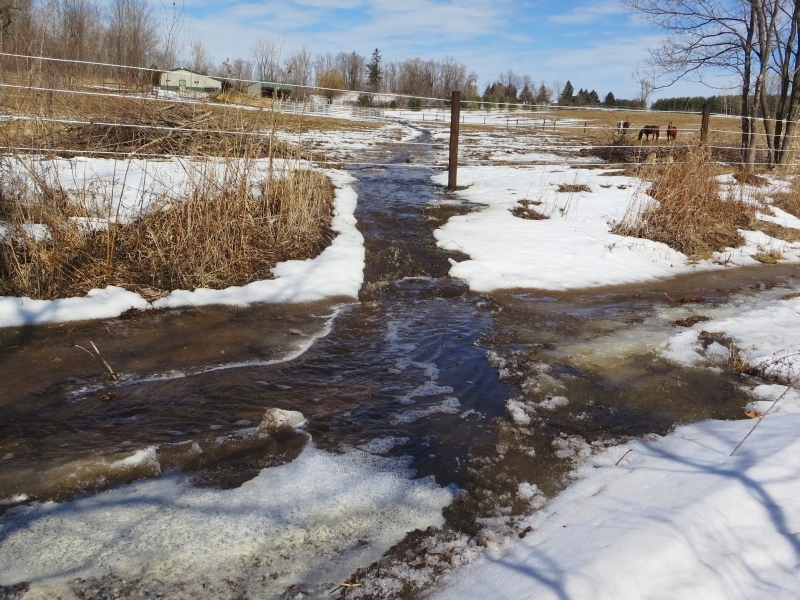 It got warm enough to melt a lot of snow yesterday. I was happy to see the drainage ditch we put in last fall is working just like we hoped it would. It’s a bit harder to know how much the drain tile is helping, since it is buried. I don’t see any obvious flow out of the ends yet, but I would assume the ground is still frozen down that low and water isn’t making it into the tubes.