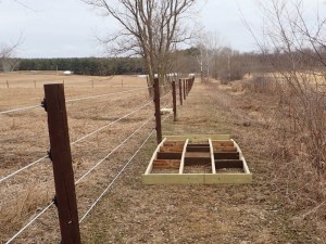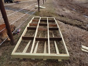 I was able to haul the boards down by the fence and begin to screw some of the cross-supports into position but quit when the time had passed for Delilah’s dinner. I’ll leave the finishing until next weekend.