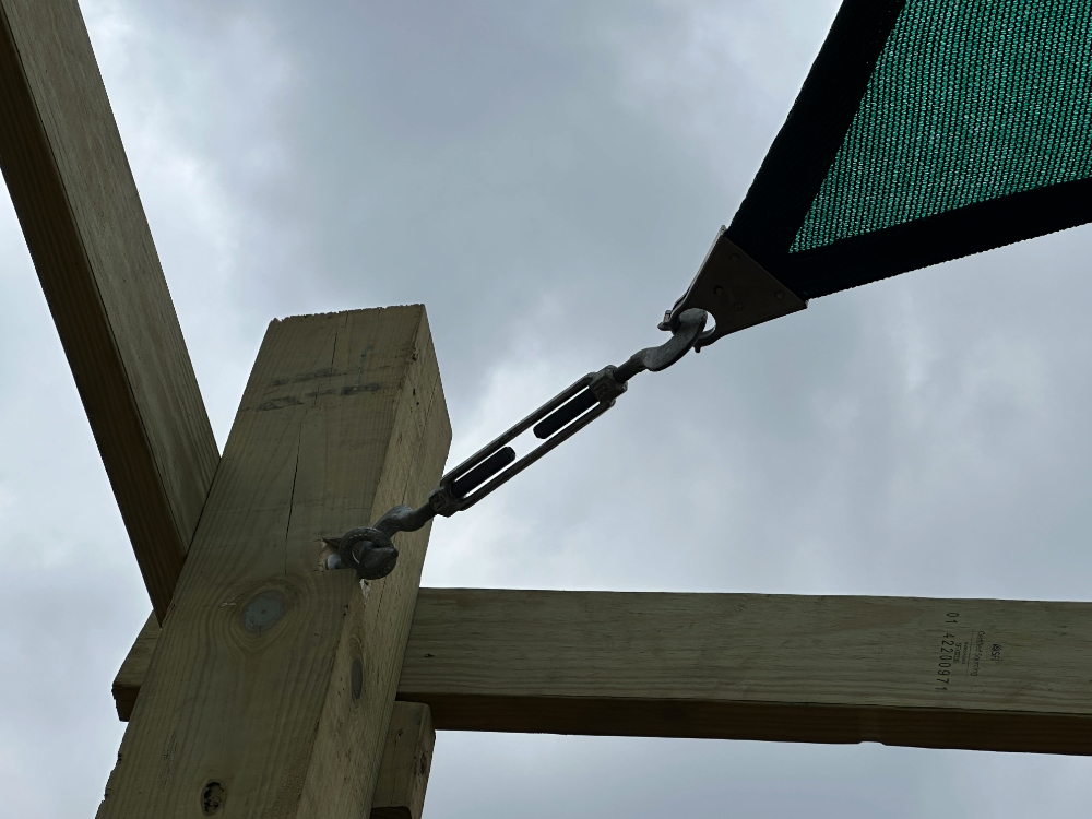 I took some pictures showing more details of the turnbuckles we are using to anchor the canopy and how we ran the eyebolts diagonally through the corners of the posts.