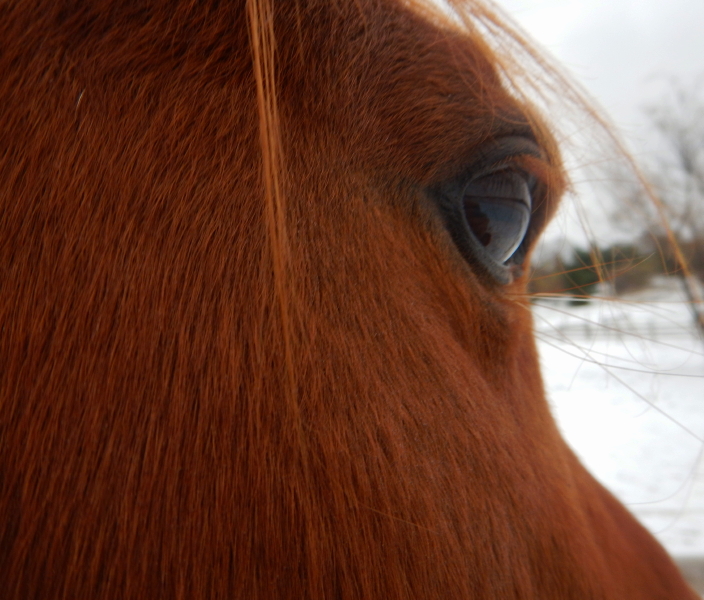 I was walking Delilah around the perimeter of the hay-field fence and the horses were out standing in the wet precipitation in the far distance of the field. The horses are well familiar with our routine of trekking this path and most days pay us little attention. Yesterday, at a moment of pause for Delilah to bury her nose in the snow in search of some potential snack, I noticed Cayenne’s energy kick up a bit toward us.