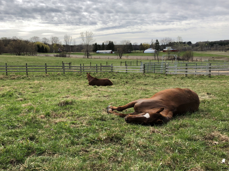As we were sitting in chairs beside a gate to the large paddock mid-morning, the four mares were finding themselves inclined toward taking a nap. A real lying down nap. All four at the same time.