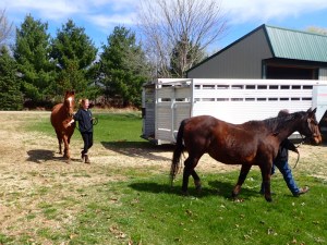 The day has come for us to receive a new batch of horses to graze our fields for the summer. Everything appears to have fallen into place right on schedule, including a delivery of bags of feed, stacked neatly in the barn a day in advance of needing them.