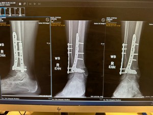 It is easy to see the holes in her bones from the screws. With the plates and screws removed, Cyndie was already able to fit into a shoe and walked into the building for the appointment.