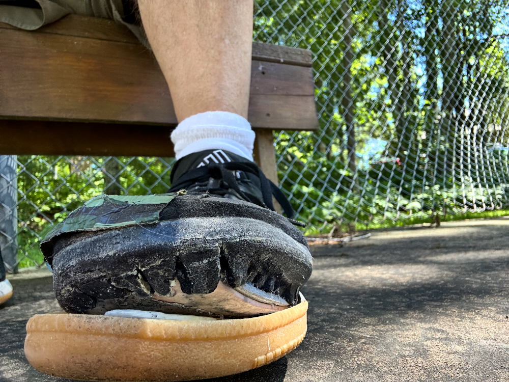 I only had enough shoe left to complete two games before needing to retire. The surface of our old tennis court is pretty rough and my shoes might be as old as the court. These Adidas have served me well for decades, so they don’t owe me any money. After many, many games of futsal on the basketball floor at the health club, I retired these shoes to the lake place for any pickup soccer games or activity on the tennis court.