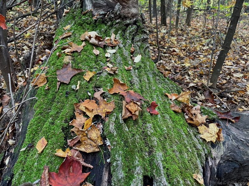 As the tree leaves lose their green color, different greens become much more apparent. Moss growth that has been around all along suddenly stands out much more vividly.
