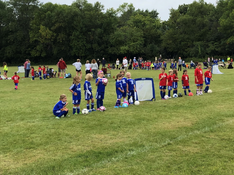After lining up and doing some individual drills, the teams took the field for a 4v4 game that ends up looking like the ball is magnetic and pulls all eight players into a tight group around it. I remember those days with our kids, but that was a long time ago.