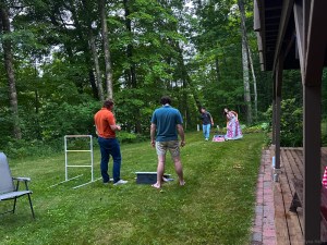 In the absence of the tourney drawing all the member families together yesterday, the evening picnic feast became the focus of the day. Since the lodge and its surroundings are currently in a state of transition, Cyndie’s family became the host location, which meant the afternoon involved moving a lot of tables and chairs from down by the lodge.
