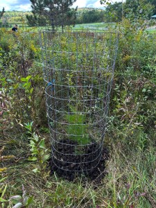 The first thing I did after breakfast was to gather the materials and install a protective fence around the little tree. Now I will have a good reference for measuring how much height it gains in the next growing season. The other volunteer Cedar tree located on the far end of that field is about twice the size of this one. It’s big enough that it doesn’t need protection.