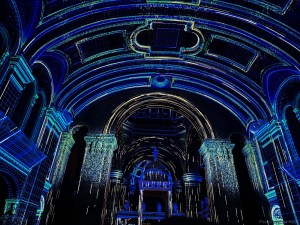 What a spectacle! 360° 3D projection set to a recorded track of dialogue and music, interwoven with a live choral performance. The light show was ever-changing, but Cyndie captured some samples that show a little of the variety of impressions they are able to create.