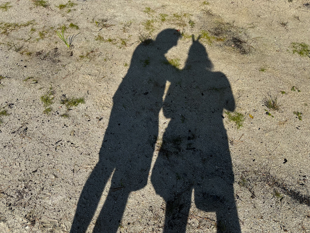 We made the best of our last full day at camp yesterday by hiking to the top of Bald Ledge, which overlooks the lake. Before heading out for the trek, Mike and I walked down to the water, where I snapped today’s featured photo. Soon after, I noticed our shadows and took a picture. Mike provided me with the classic bunny ears.