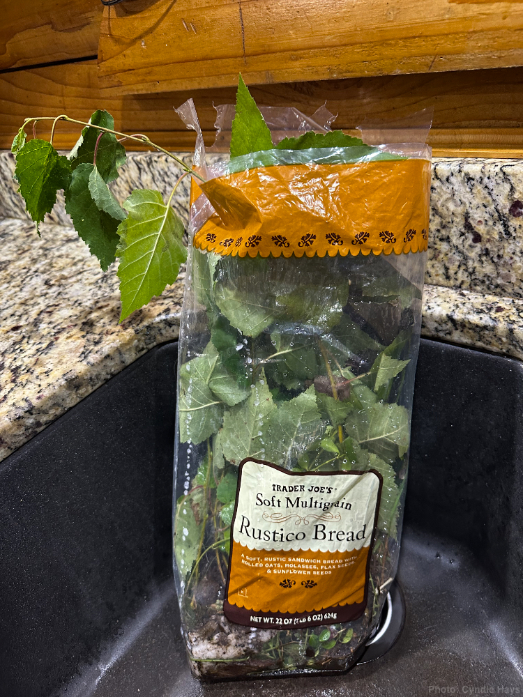 Never one to be intimidated by logical limitations about packing live plants in a plastic bread bag to stuff into an already full carry-on bag that gets crammed below the seat in front of her on an airplane, Cyndie brought home trees from the garden in Maine to plant somewhere around Wintervale.