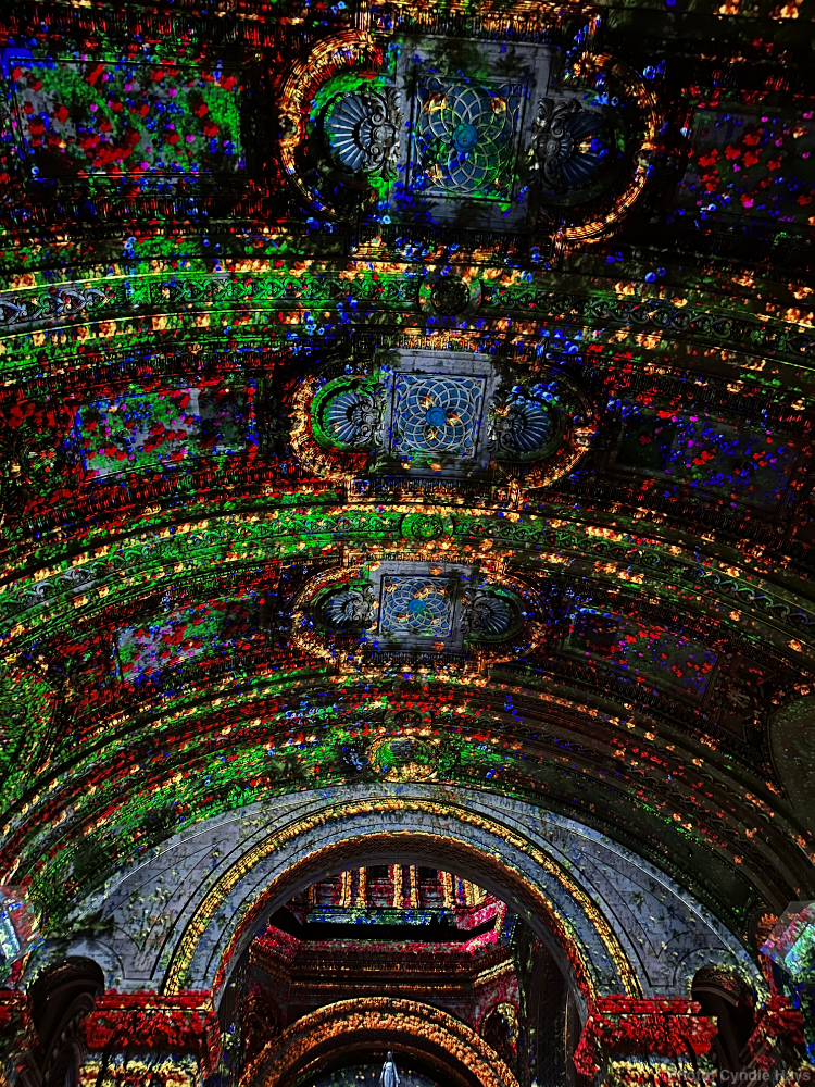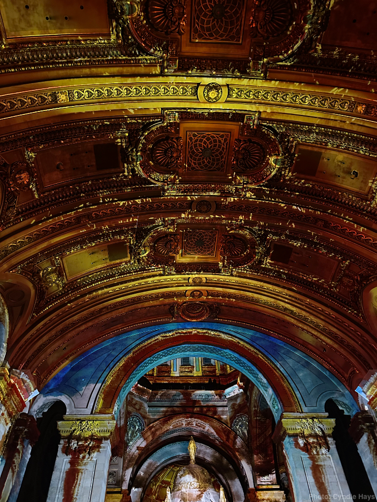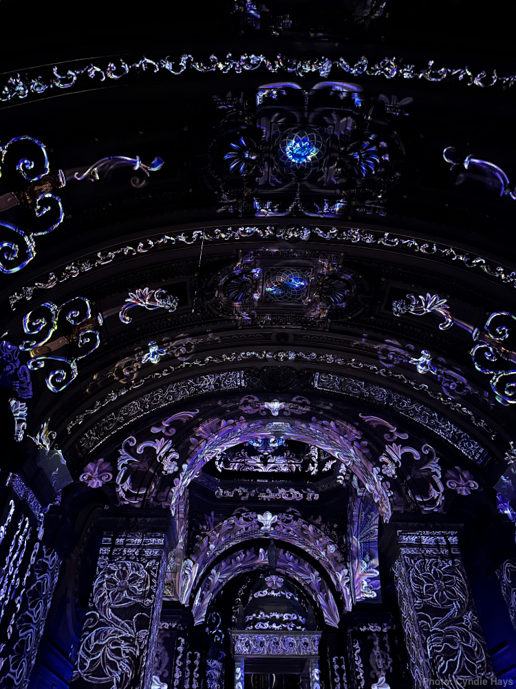 What a spectacle! 360° 3D projection set to a recorded track of dialogue and music, interwoven with a live choral performance. The light show was ever-changing, but Cyndie captured some samples that show a little of the variety of impressions they are able to create.