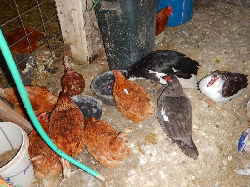 The ducks and chickens were particularly anxious about getting a drink of water. Their pans for water are not currently heated, so when their liquid becomes a solid, they have to leave the relative warmth of walls and a roof, and venture outside the barn to one of the troughs that have heaters serving the larger animals. A number of them seemed to prefer waiting until we arrived, based on their eager impatience.