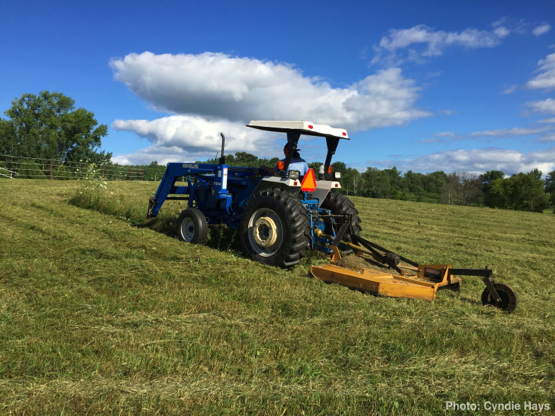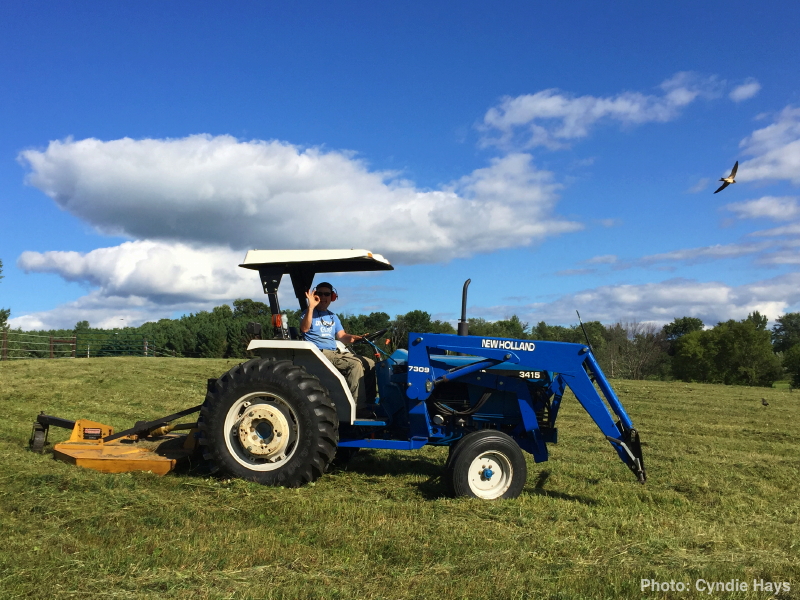 When I got to the last little strip to be mowed, I wanted to include Cyndie in the moment of achievement. She was serving the horses their evening feed at the barn, so I whistled to get her attention as I was lining the tractor up for the final cut.