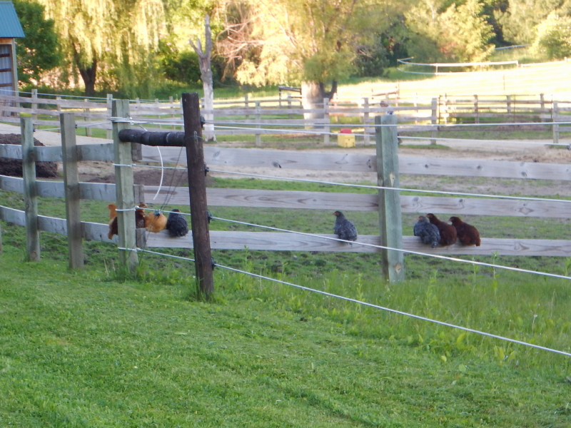 Speaking of caring for our animals, I caught a picture of her the other day, giving Legacy a massage. That was about the same time I spotted the chickens hanging out on the bottom board of the paddock fence.