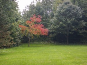 That tree in our back yard which leads the way in changing colors is cranking it up to full blaze now that we have arrived within the month of September. This image doesn’t to justice to the view, because our sunlight was muted by the smoke of wild fires in Canada and the western U.S. most of the day yesterday.