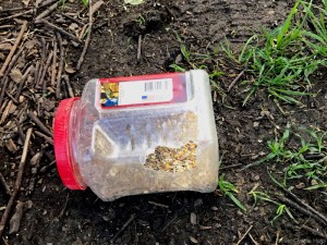 That plastic container was inside the coop earlier in the afternoon. Cyndie discovered it chewed through and outside on the ground. There were no eggs in the nest box, either, but it wasn’t clear if this just happened to be a day when the two active layers both took a break, or not.