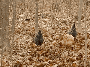 Yesterday, the three adult hens were busy aerating the forest floor.