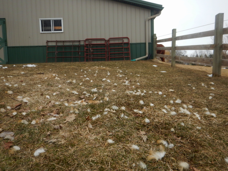 Legacy had rebuffed Cyndie on Saturday when she brushed out the rest of the herd, so she tried again at feeding time last night. He tolerated her efforts while munching the fresh hay she had just served. The ground was an eye-catching spectacle of white hair.