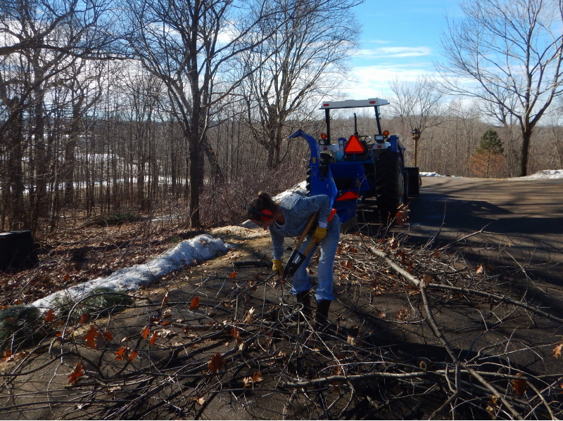 Cyndie helped to bring branches from farther and farther, and worked to cut junctions that “Y” off too wide to fit the bottom of the narrowing chute. We parked the tractor on the solid pavement of the driveway to be out of the mud that is quickly becoming the prevailing footing during this unbelievable February melt down.