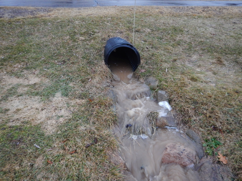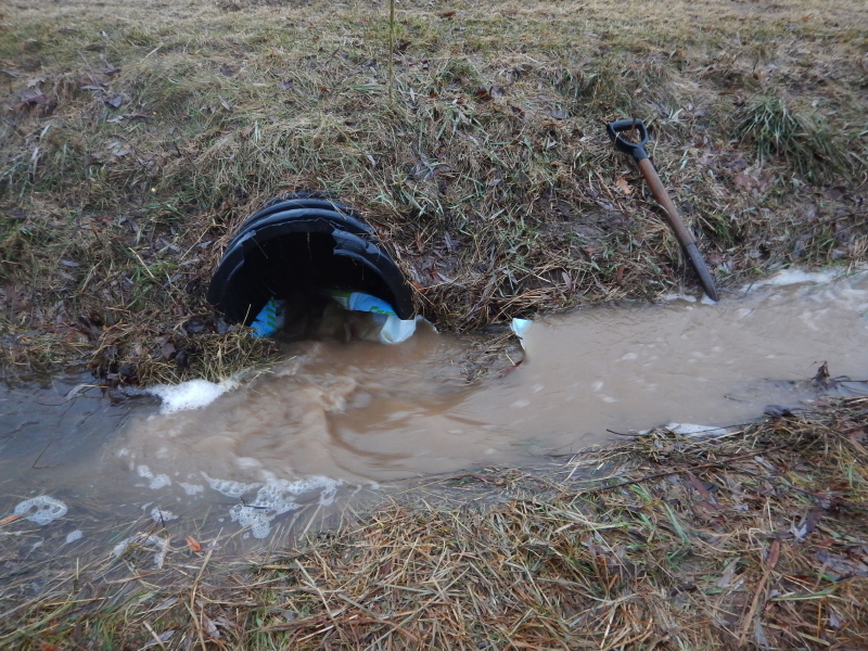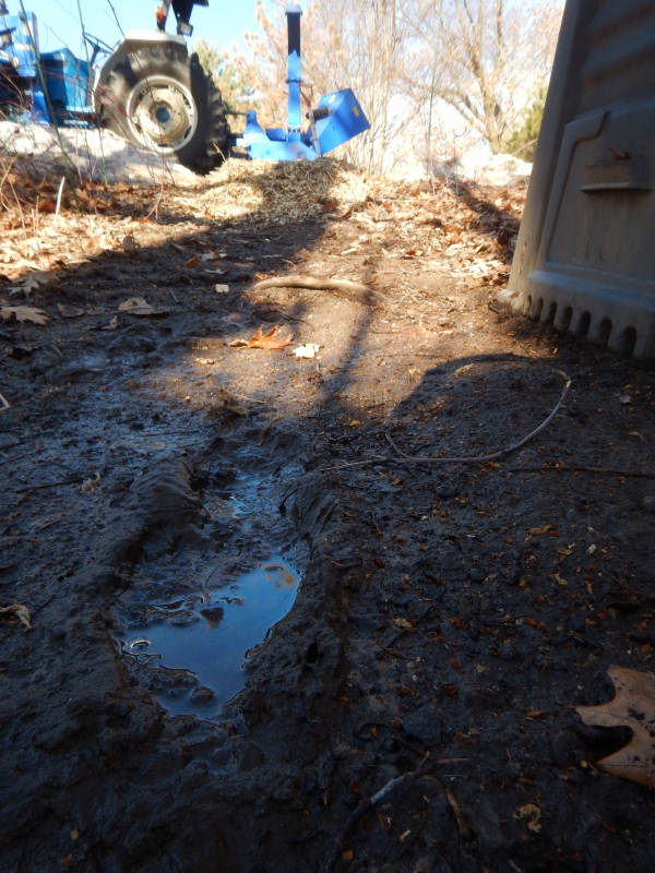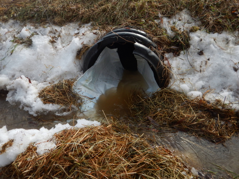 On Sunday, I just happened to stumble upon the fact that the snow-melt flowing down our drainage swale from beneath the driveway wasn’t coming out of the culvert.
