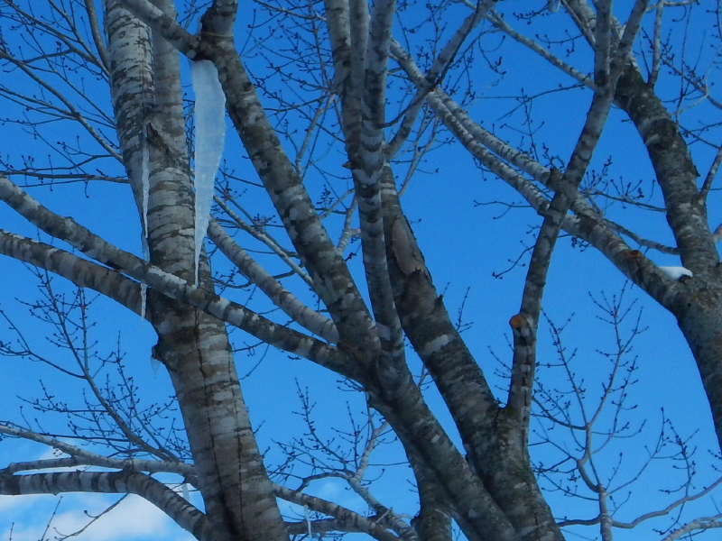 I parked the Grizzly in the sunshine to melt the snow off the blade while I pulled out a shovel to clean up the edges. That’s when some maple-sicles caught my eye.