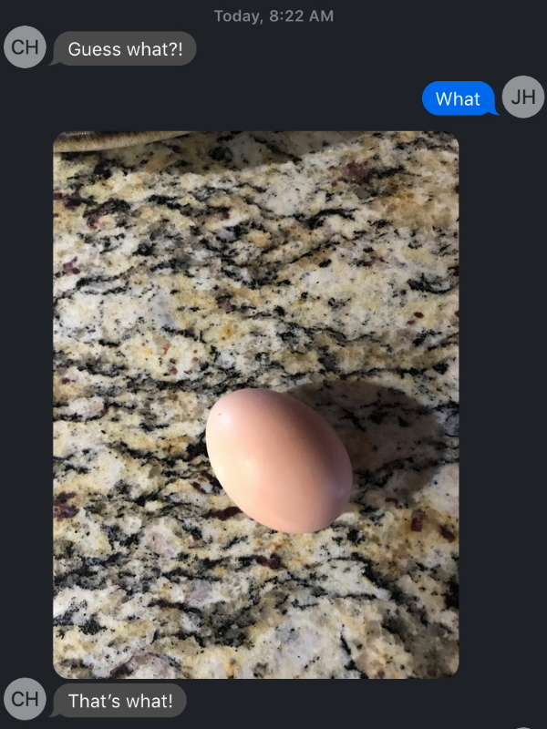 Maybe that egg surprised the hen. Cyndie reported it was in the sand covering the floor of their coop, not one of the nest boxes.