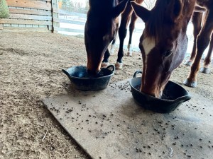 When circumstance has allowed, I have also experimented with changing who gets paired or switching to three horses on one side and one horse on the other. Since Mix and Mia both get the same-sized portion of feed, I like having them together on one side. Then I don’t have to care if any of the four try to switch.