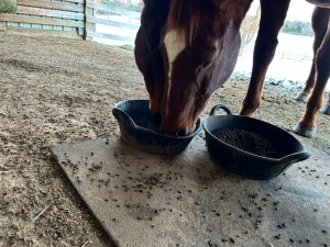 I continue refining my technique for serving the horses their three feed sessions. Since half of them are supposed to receive larger portions, I can’t just leave them on their own or the bolder ones will move in and push away the two who should get the larger servings.