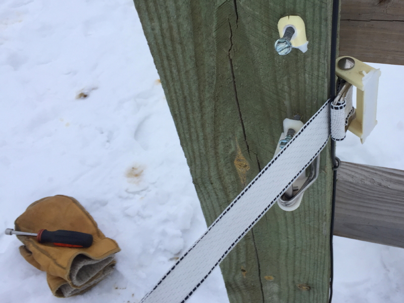 Over the weekend I noticed one of our web fence lines was loose. Leaving the plowed pathway, I climbed through un-energized fence wires to get to the source of the problem. Somebody had busted the plastic mount holding the web anchor.